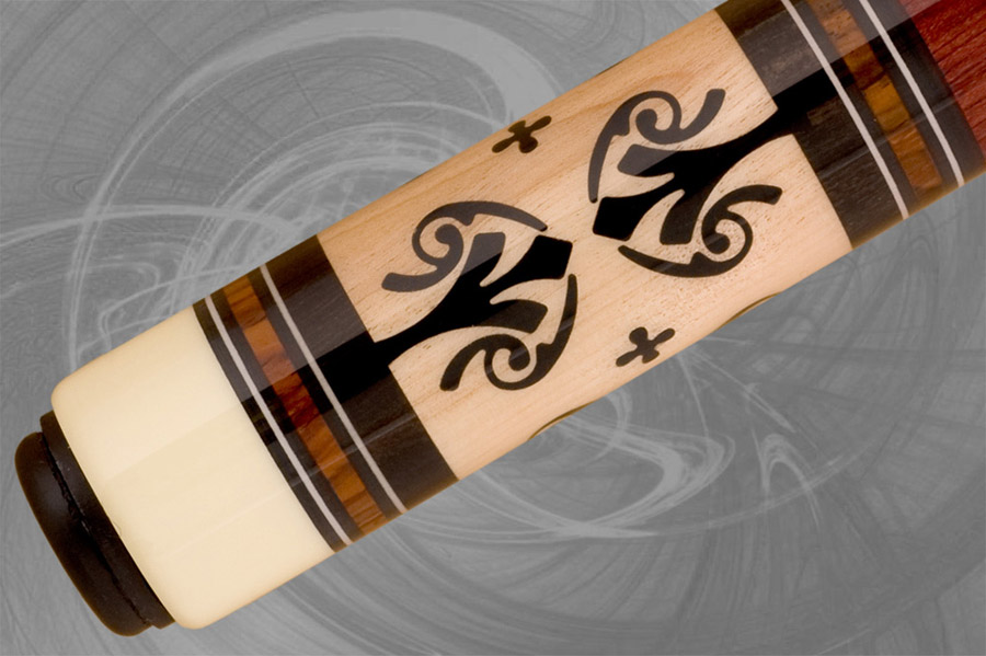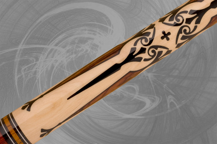 Section du haut et talon en érable ondulé. Manche en satiné rubané (exclusivité Stéphanole Nole). Incrustations et bagues en ébène et cocobolo.