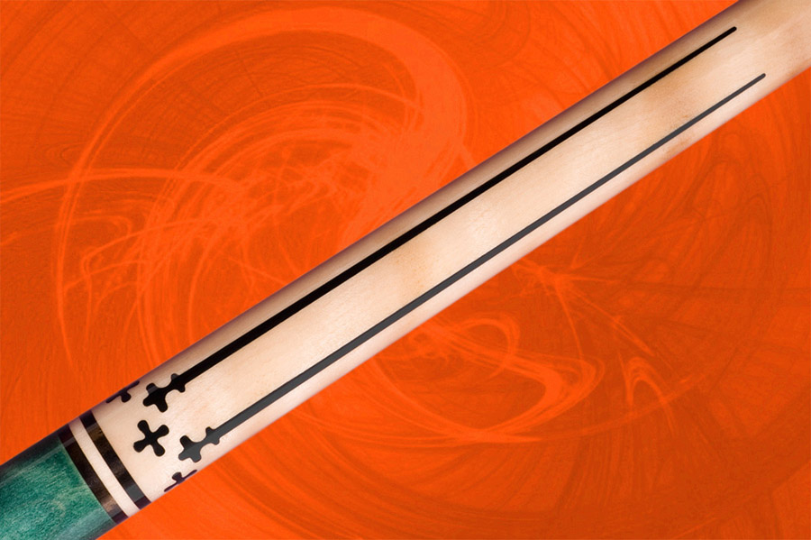 Queue de billard en érable ondulé avec des bagues décorative de couleur verte en érable ondulé. Incrustations d'ébène. Bague décorative en ébène.