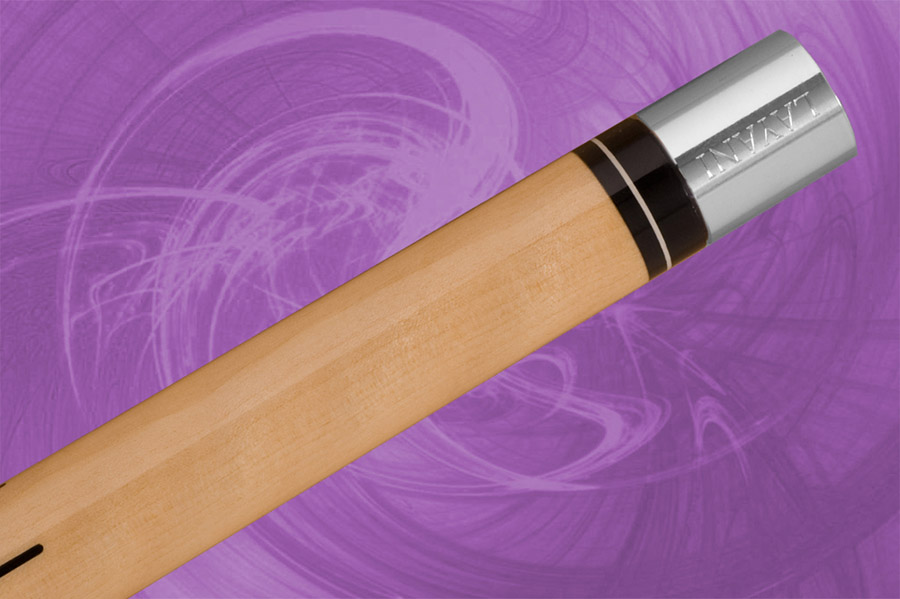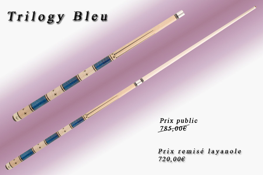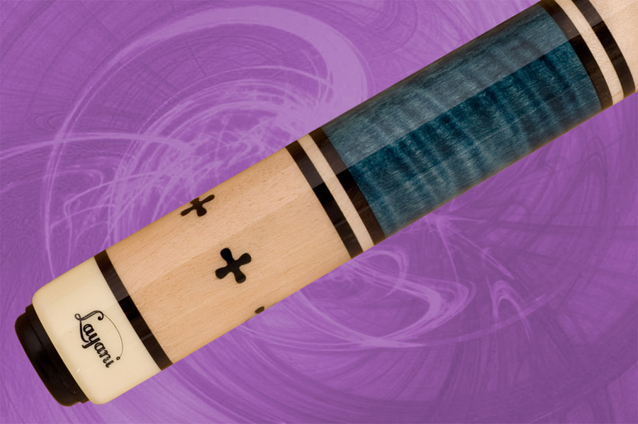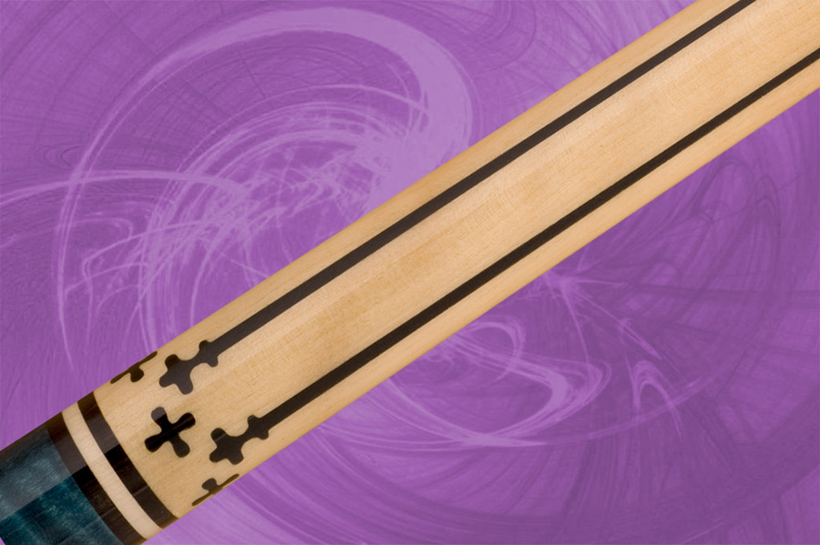 Queue de billard en érable ondulé avec des bagues décorative de couleur bleu en érable ondulé. Incrustations d'ébène. Bague décorative en ébène.