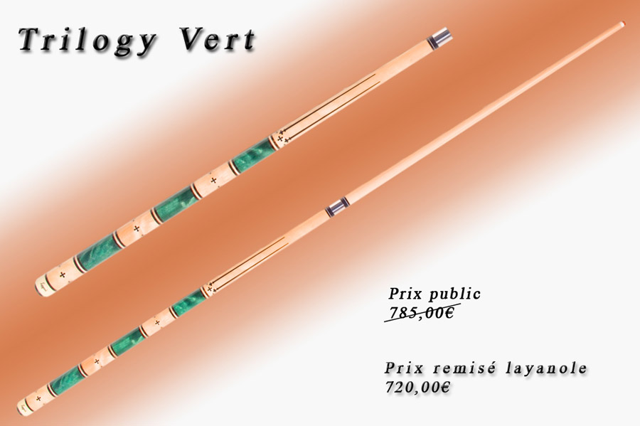 Queue de billard en érable ondulé avec des bagues décorative de couleur verte en érable ondulé. Incrustations d'ébène. Bague décorative en ébène.
