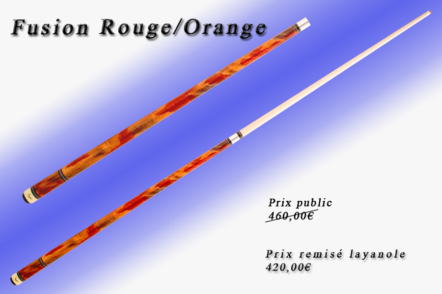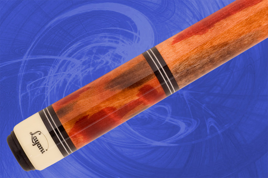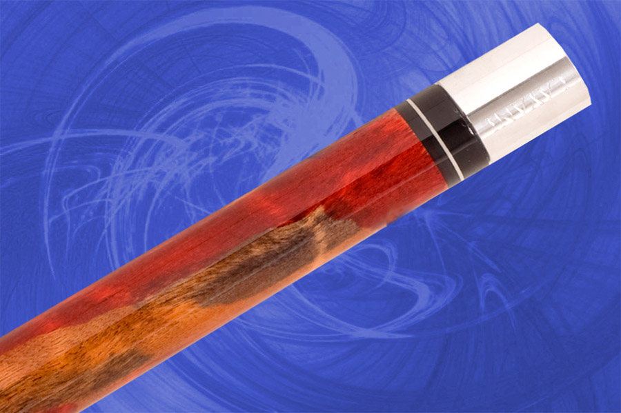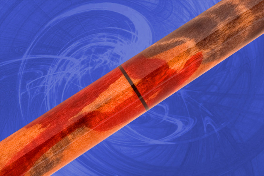 Queue de billard en érable ondulé teinté rouge et orange.