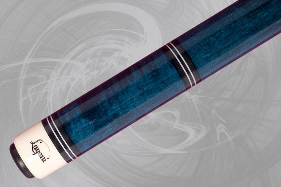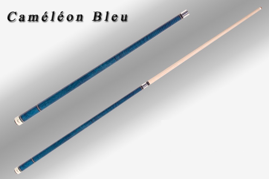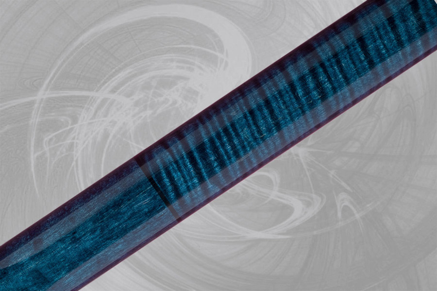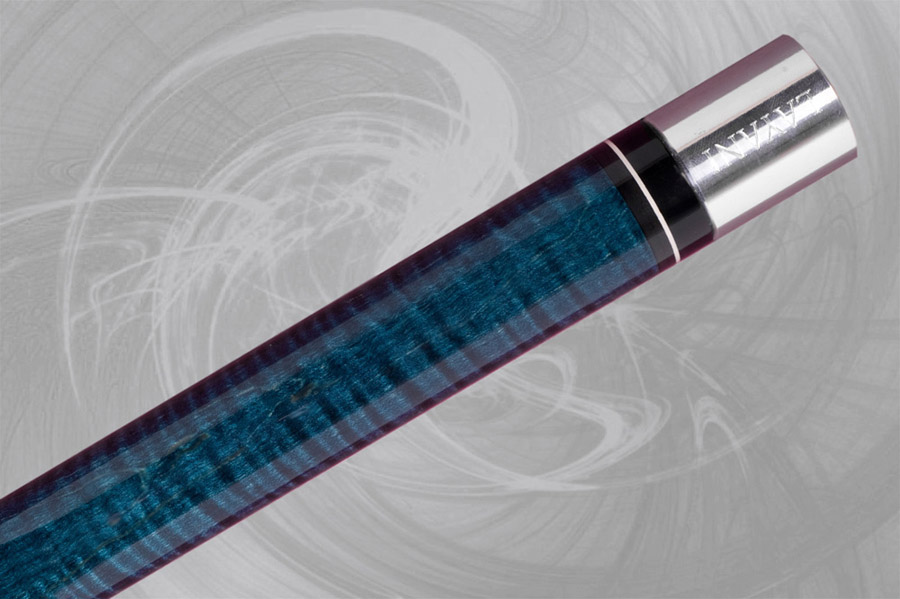 Section du haut, manche et talon en érable ondulé avec teinture bleue. Bagues décoratives en ébène.