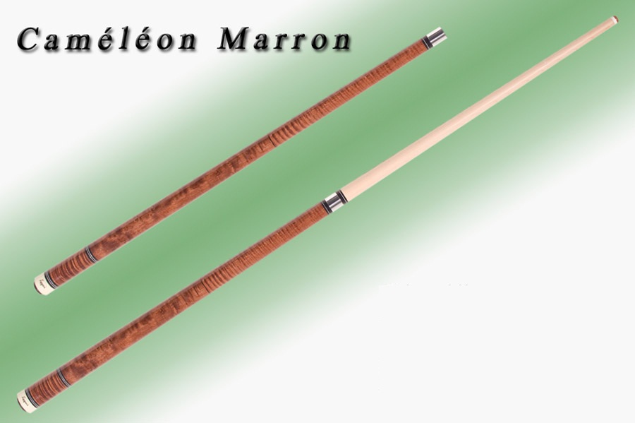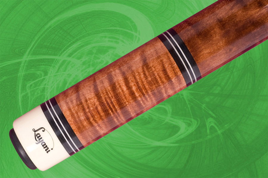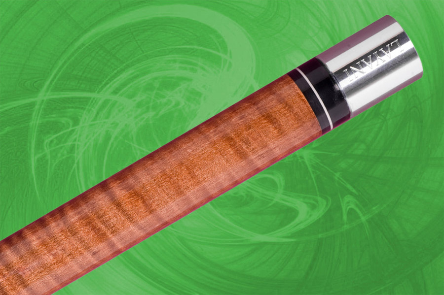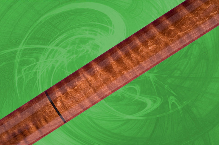 Section du haut, manche et talon en érable ondulé avec teinture noyer. Bagues décoratives en ébène.