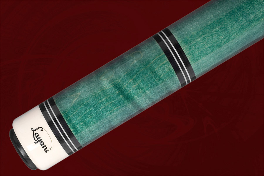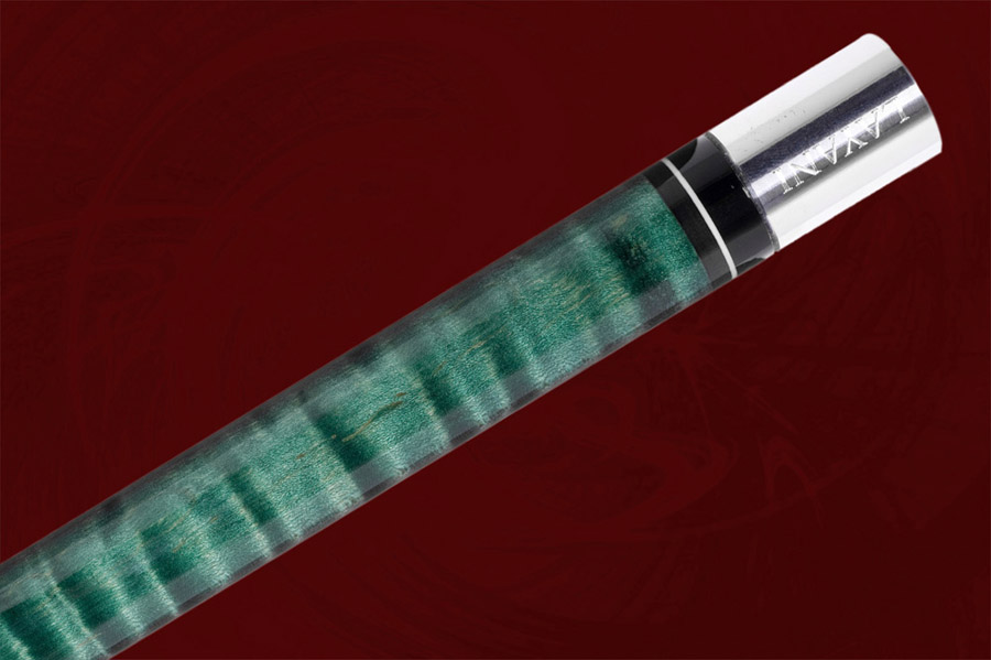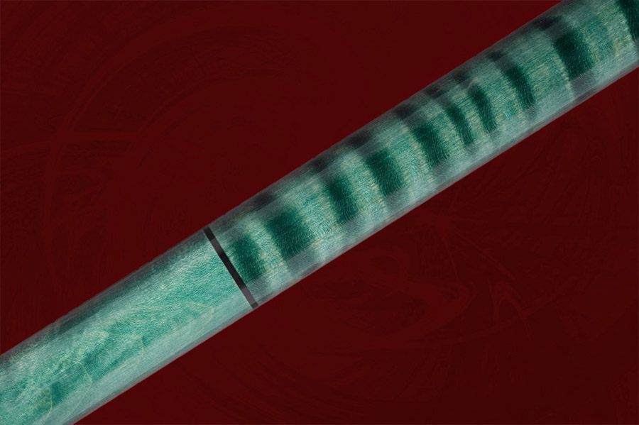 Section du haut, manche et talon en érable ondulé avec teinture orangée. Bagues décoratives en ébène.