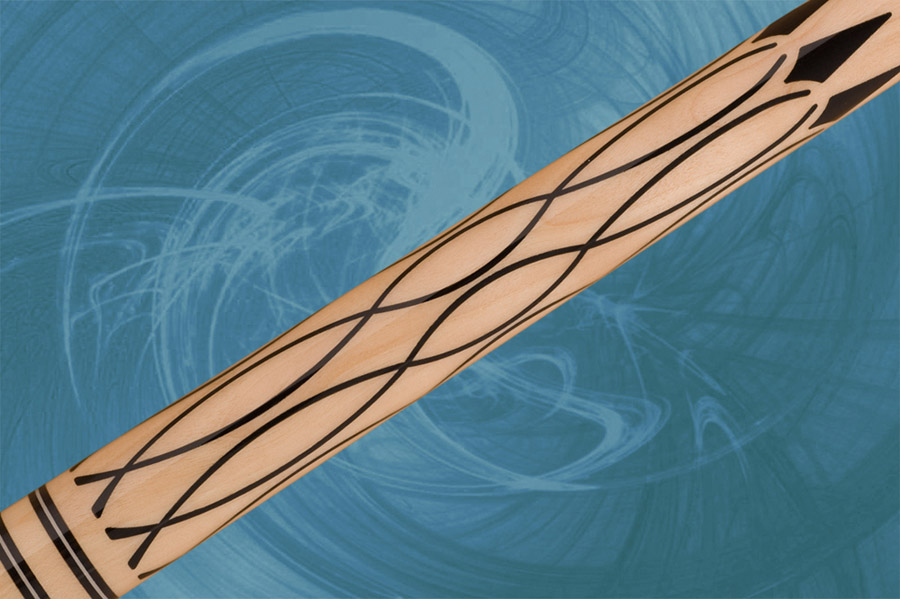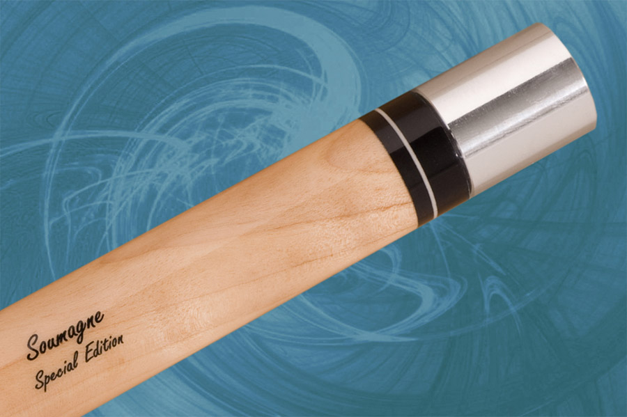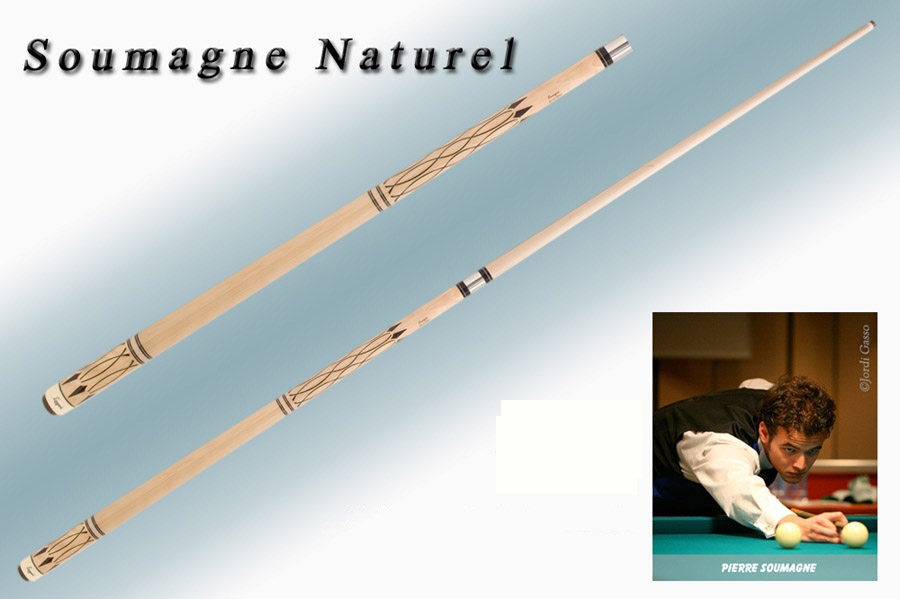 Ce modèle a été conçu pour Pierre Soumagne, champion de France et champion d'Europe aux jeux de séries. Section du haut et talon en érable ondulé. Incrustations très fine en ébène. Conçu plus particulièrement pour le 3 bandes, mais peut être utilisé pour les jeux de séries à partir de 480 g.